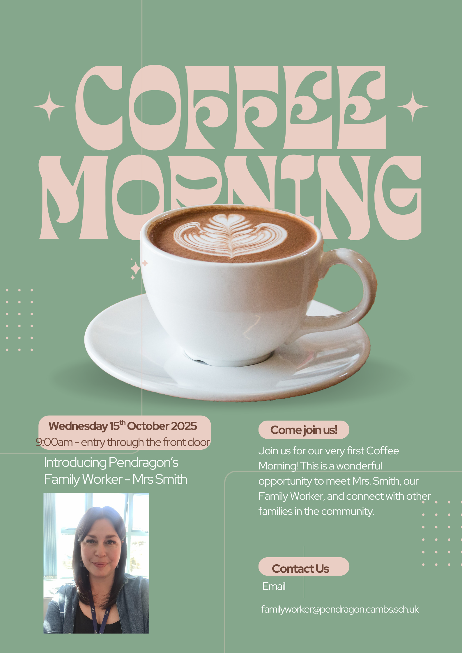 Familyworker@pendragon.cambs.sch.ukMrs Smith is in school every Monday, Tuesday, Wednesday and Friday from 8.30am-315pm.